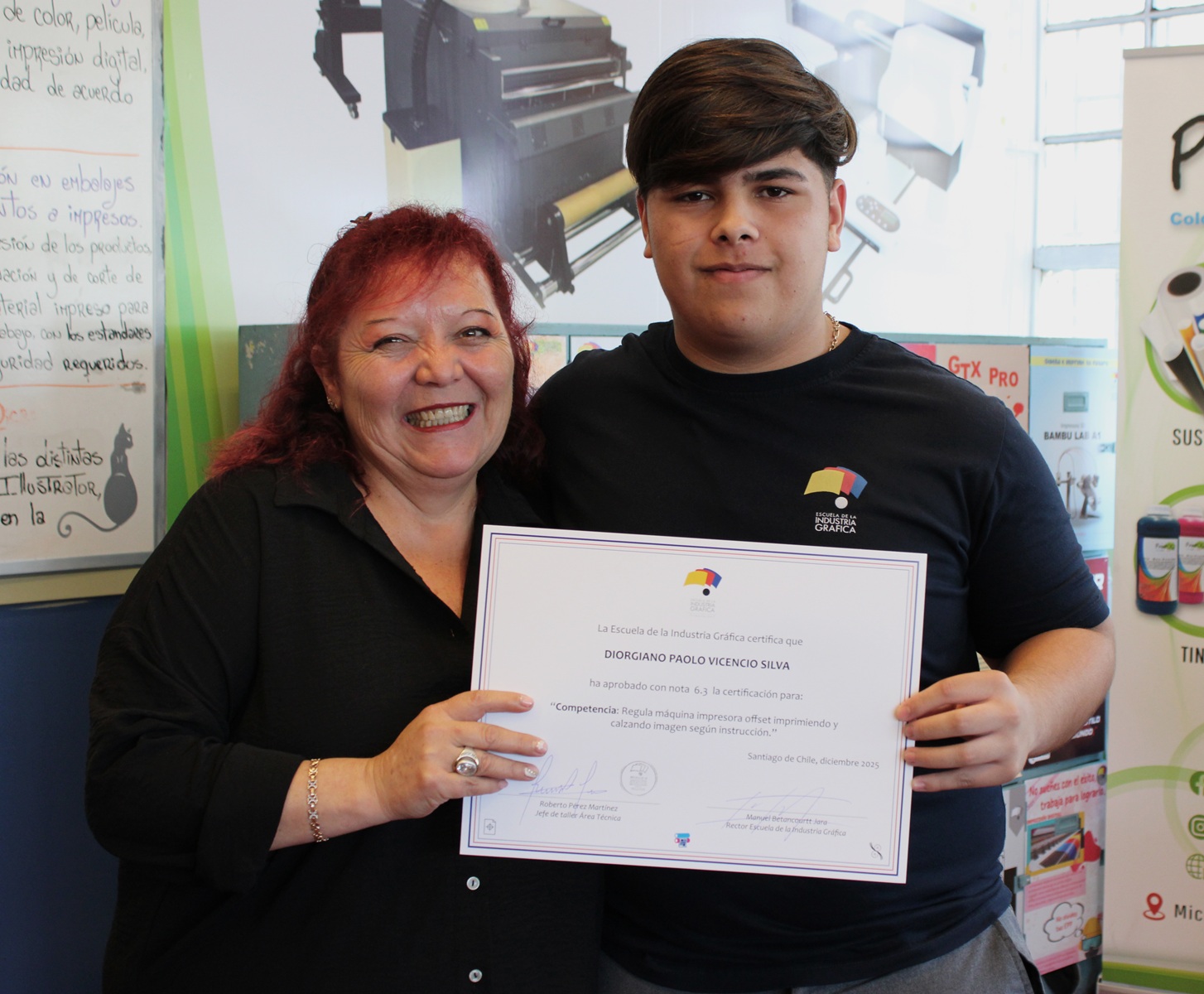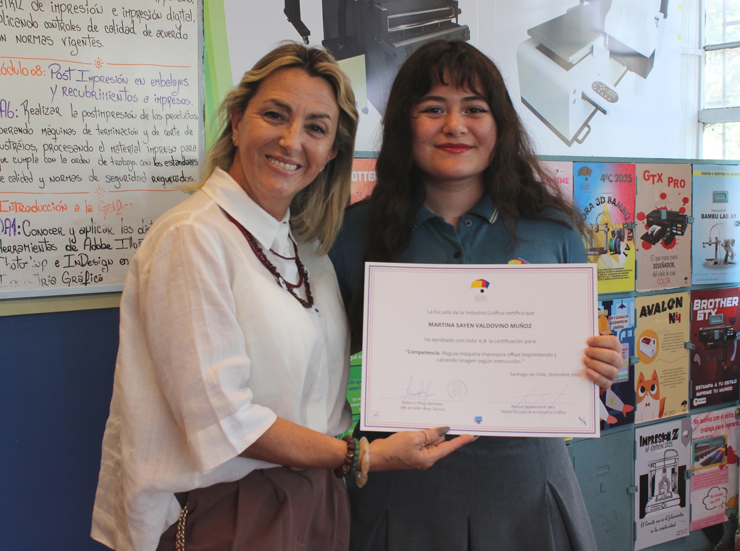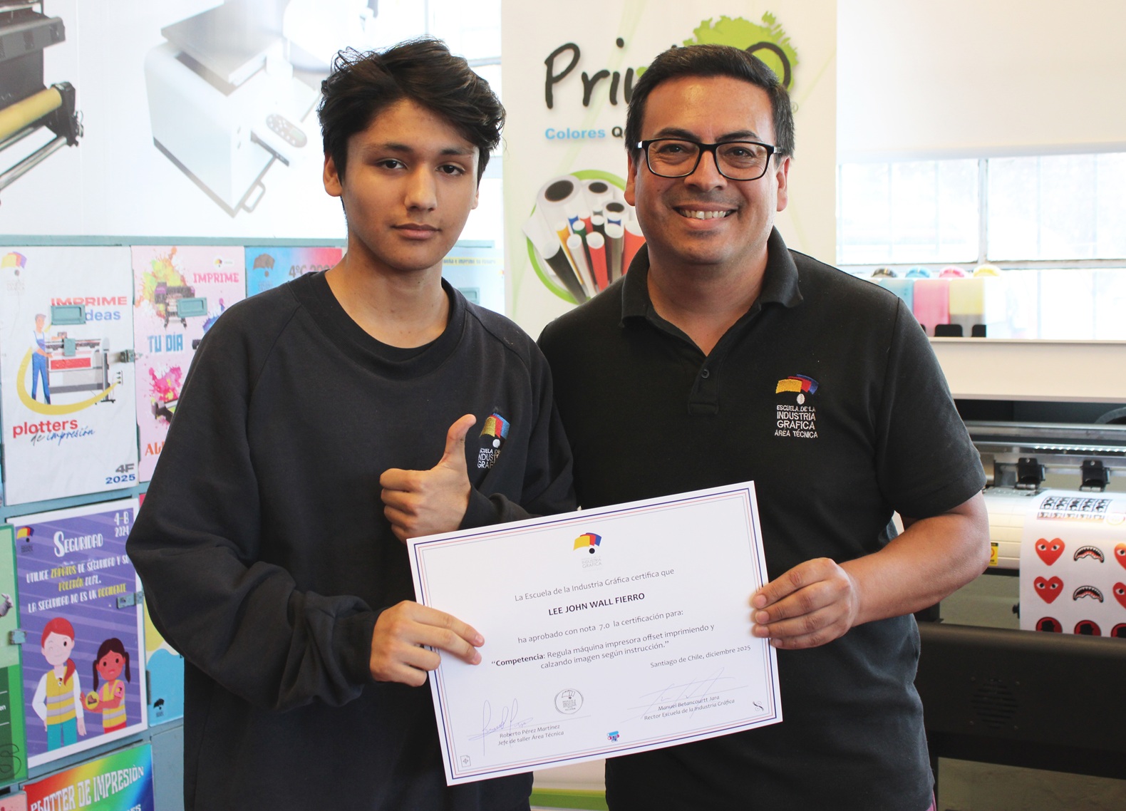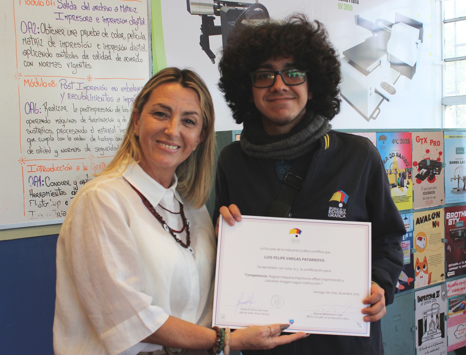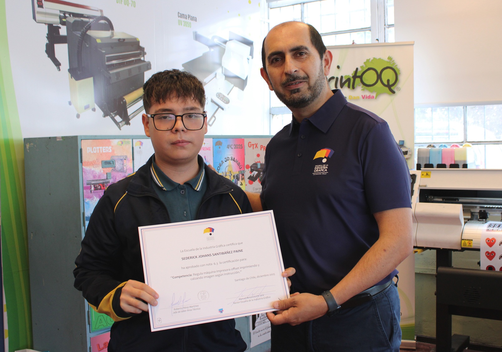 El pasado miércoles 10 de diciembre se llevó a cabo la entrega de certificaciones correspondientes a la última evaluación de competencias del año escolar 2025, orientada a la regulación de la máquina impresora offset, así como a los procesos de impresión y calce de imagen conforme a instrucciones técnicas.