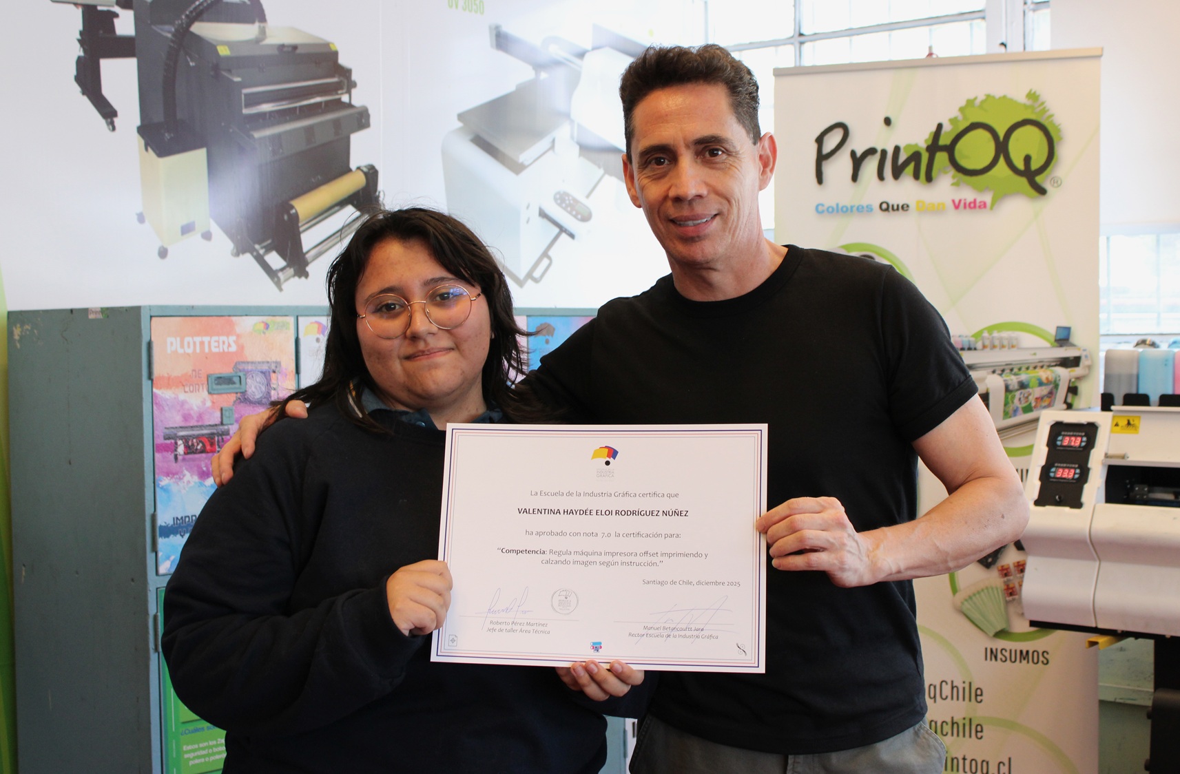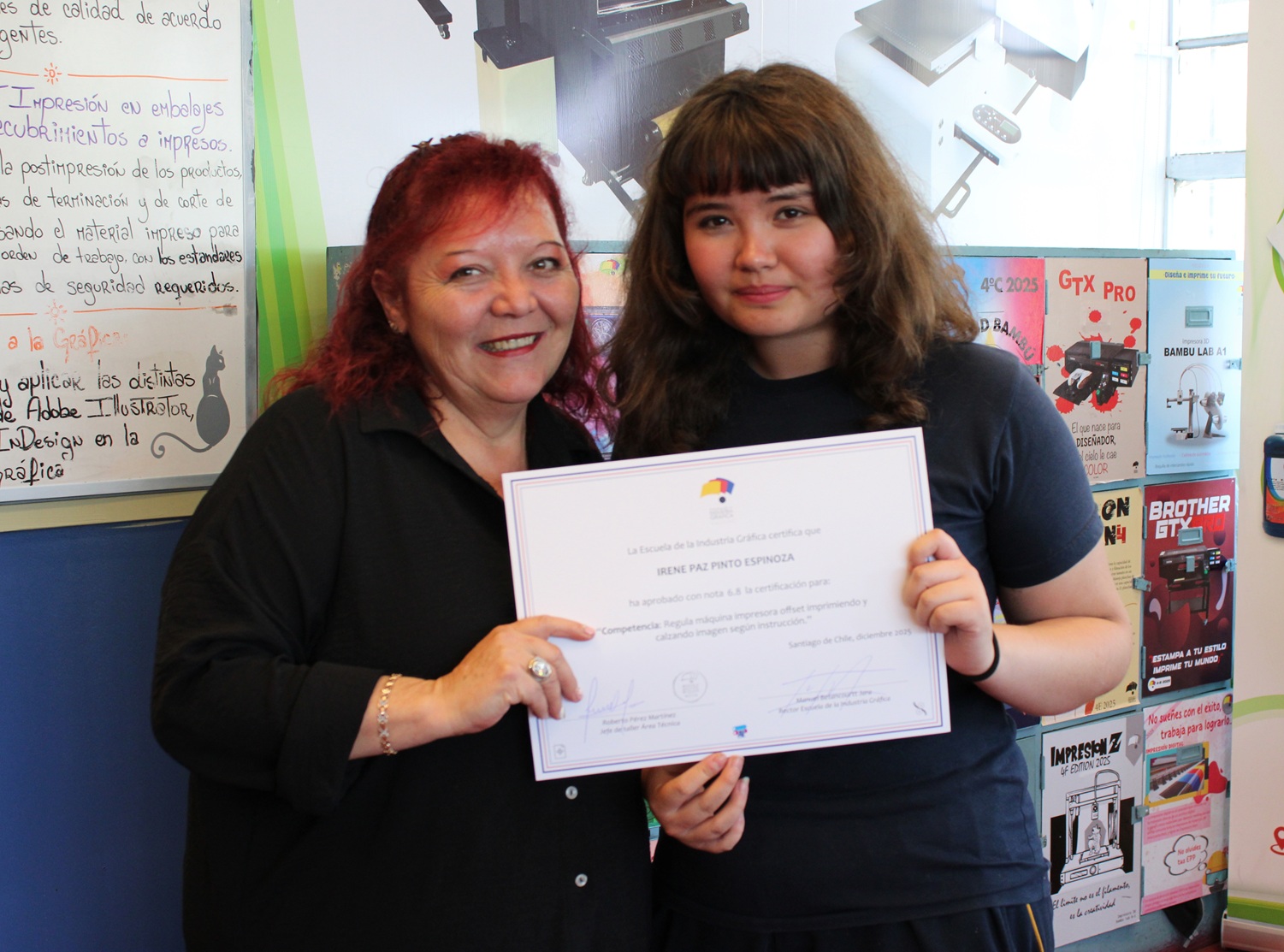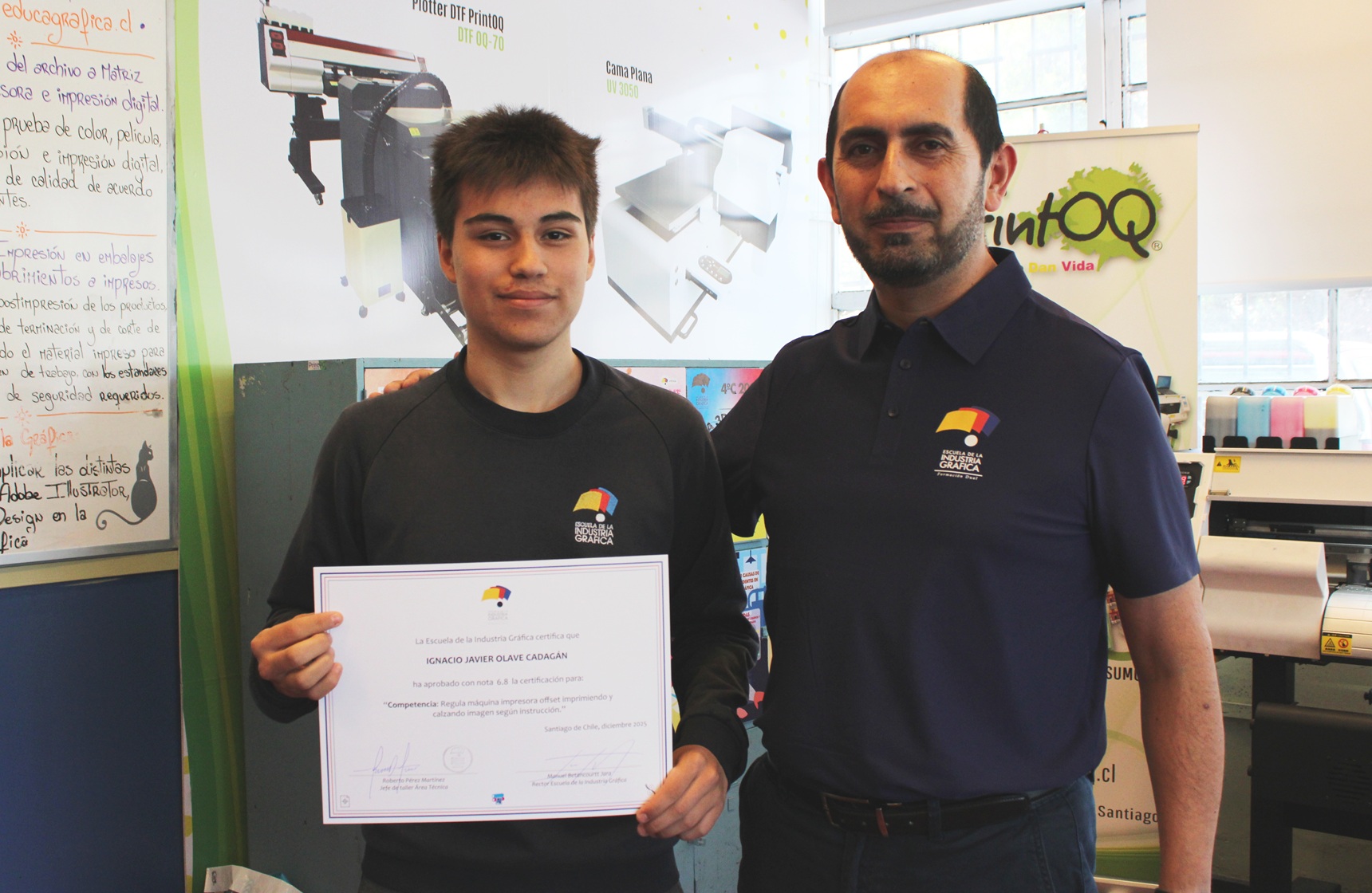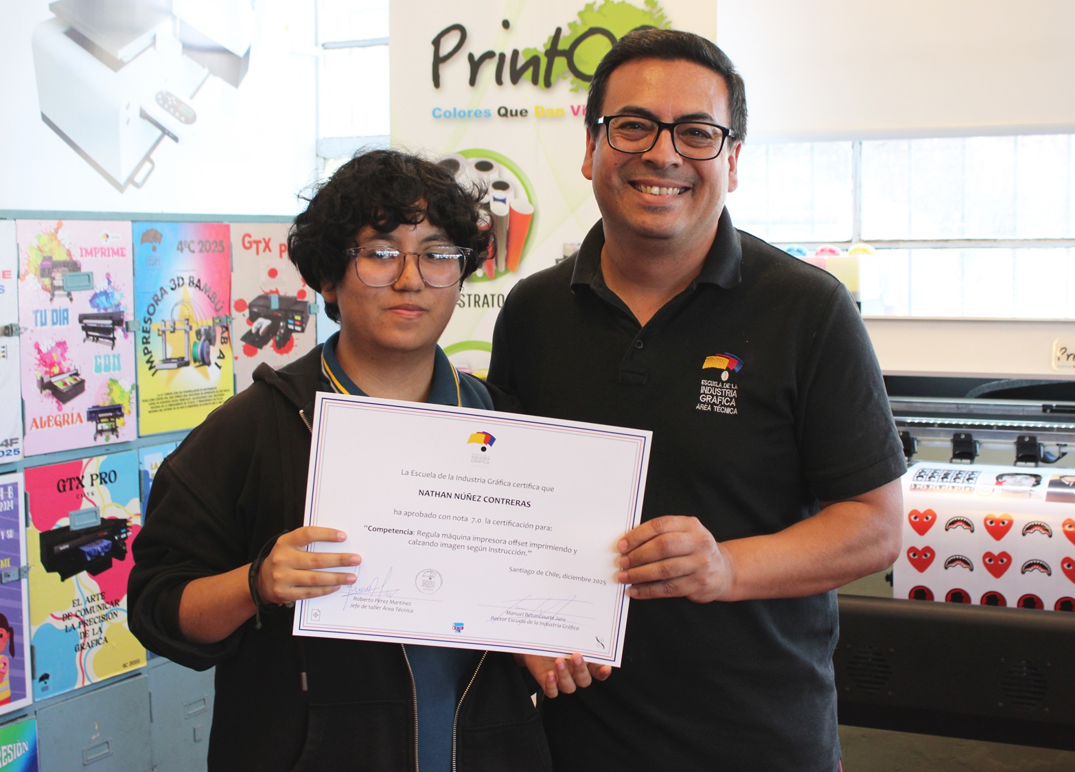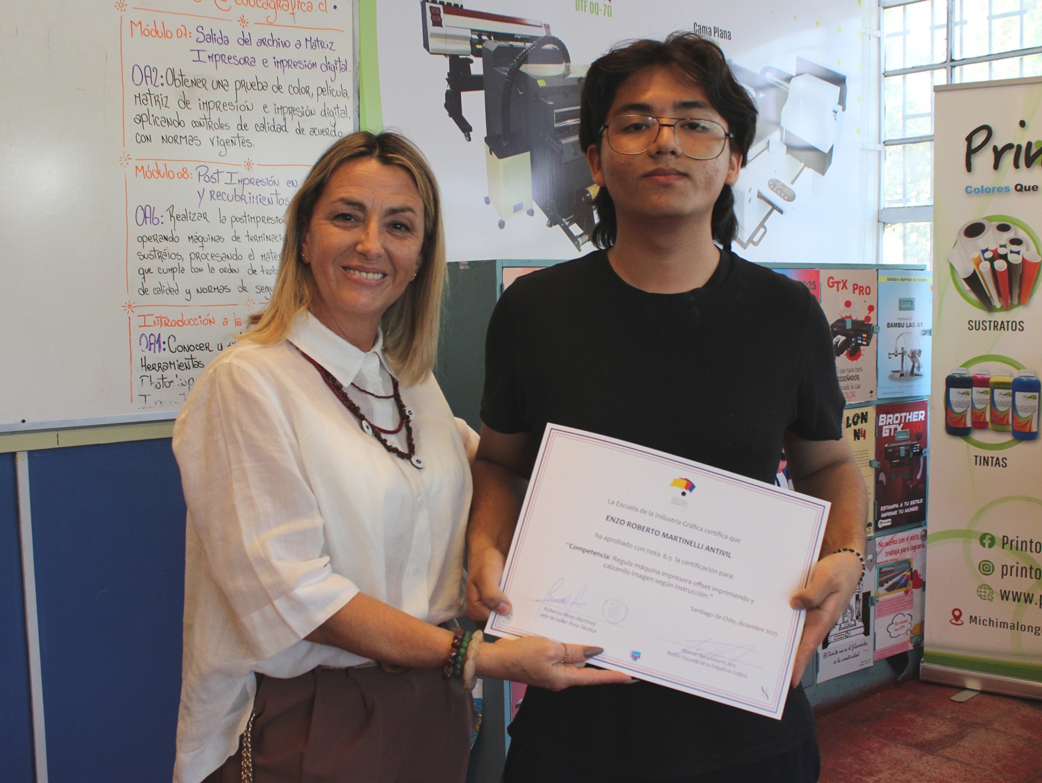 El pasado miércoles 10 de diciembre se llevó a cabo la entrega de certificaciones correspondientes a la última evaluación de competencias del año escolar 2025, orientada a la regulación de la máquina impresora offset, así como a los procesos de impresión y calce de imagen conforme a instrucciones técnicas.