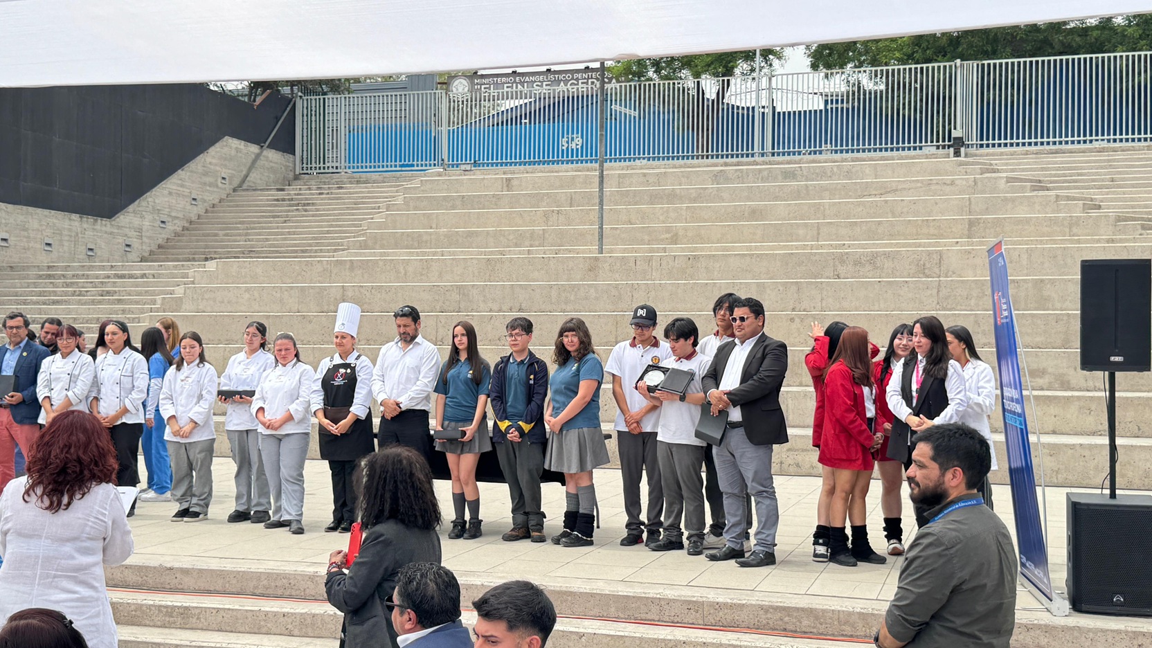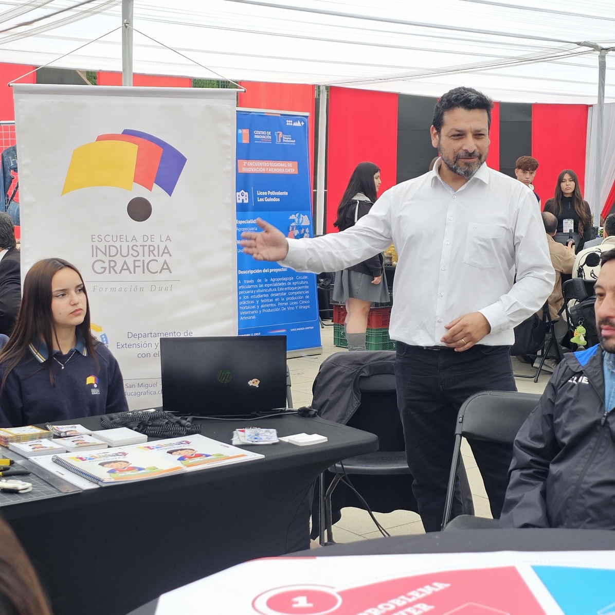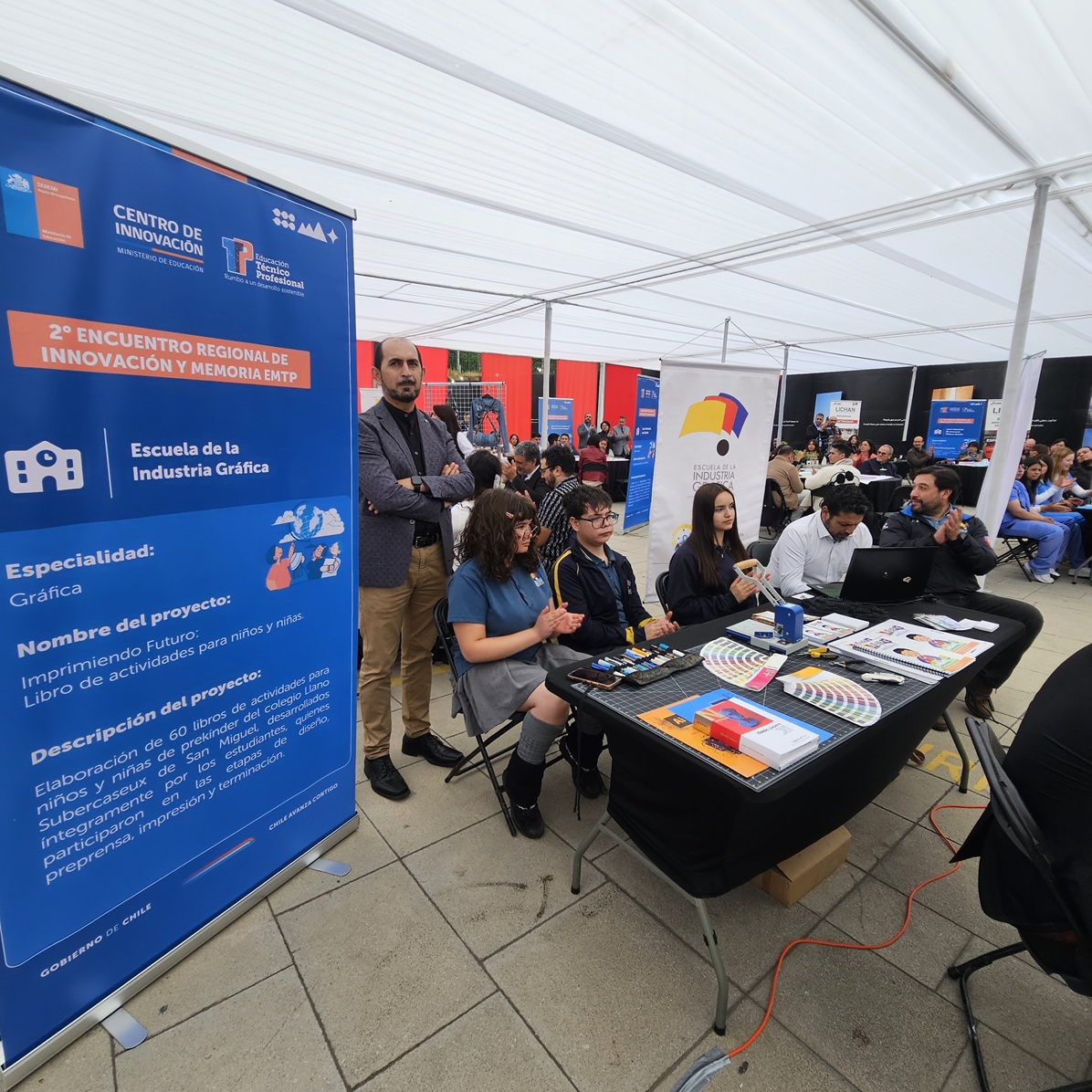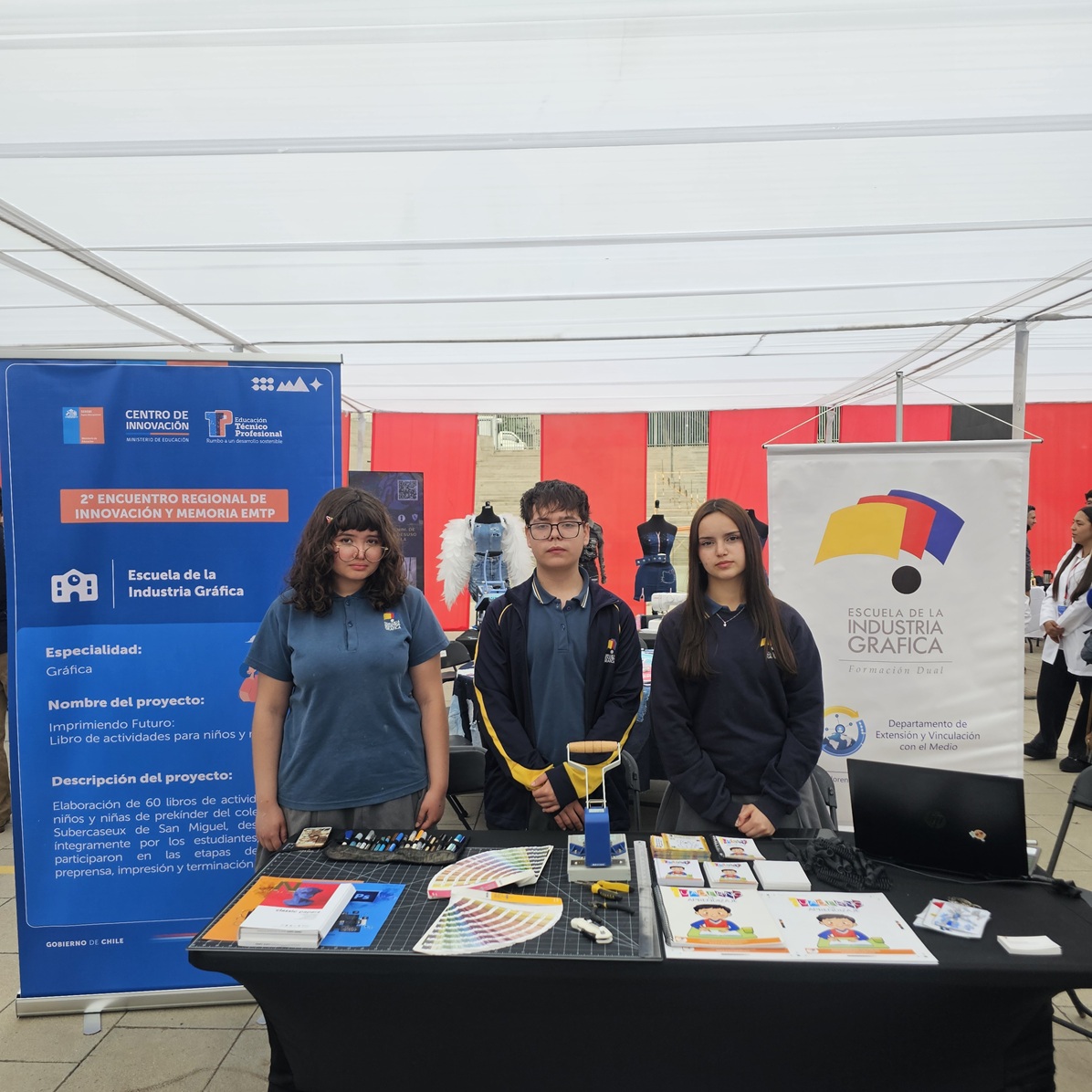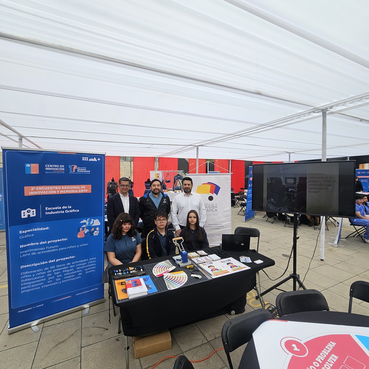 En representación de nuestra escuela participaron los profesores Patricio Lizama, jefe del Departamento de Extensión; Nelson Díaz, jefe pedagógico del Departamento de Extensión; y José Luis Gutiérrez, docente del área técnica en compañía de tres estudiantes participantes de: “Imprimiendo Futuro: Libro de actividades para niños y niñas”, un proyecto desarrollado por estudiantes de 3° y 4° medio para el Colegio Llano Subercaseaux de la comuna de San Miguel.
